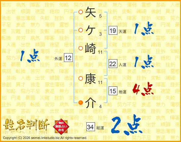 矢(5画)ケ(3画)崎(11画) 康(11画)介(4画)