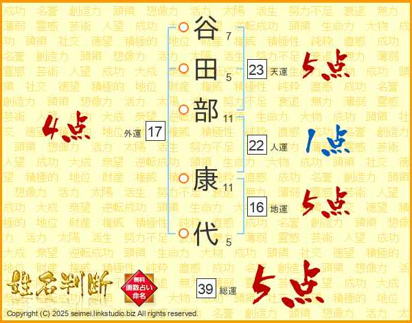 谷(7画)田(5画)部(11画) 康(11画)代(5画)