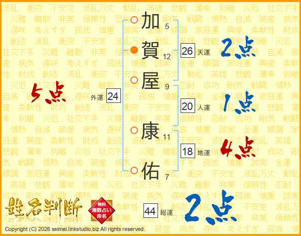 加(5画)賀(12画)屋(9画) 康(11画)佑(7画)