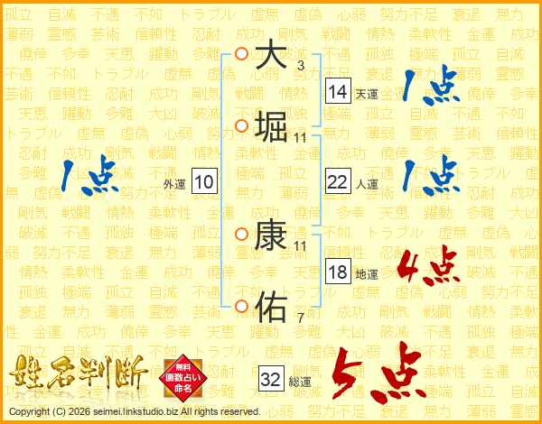 生活面を象徴する運勢です。外部から受ける影響力を表し、結婚運、家庭運や職場、環境への順応性を表します。総運から人運を引いた画数。姓や名が1文字の場合を除く。
