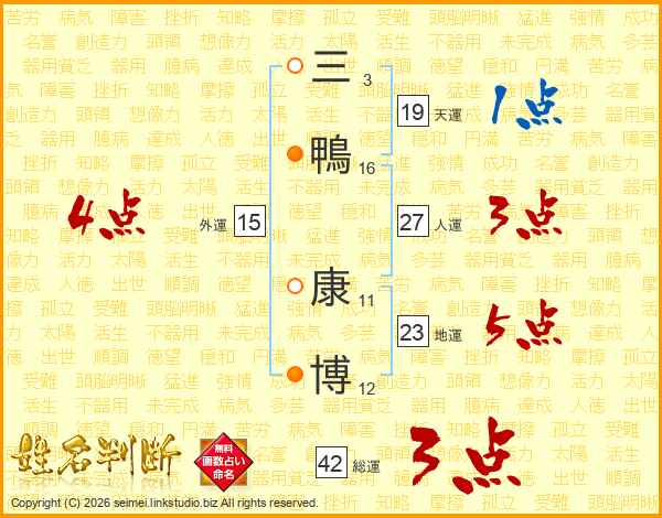 生活面を象徴する運勢です。外部から受ける影響力を表し、結婚運、家庭運や職場、環境への順応性を表します。総運から人運を引いた画数。姓や名が1文字の場合を除く。