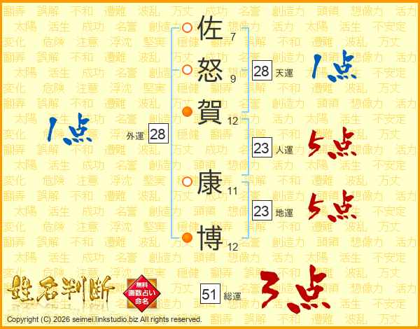 佐(7画)怒(9画)賀(12画) 康(11画)博(12画)