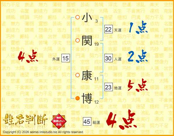 あなたの人生を表す1番重要な運勢です。生涯を通じて影響する総合運となり、主に50歳以降の晩年期に影響を及ぼします。苗字と名前の合計画数。