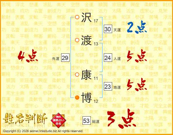 生活面を象徴する運勢です。外部から受ける影響力を表し、結婚運、家庭運や職場、環境への順応性を表します。総運から人運を引いた画数。姓や名が1文字の場合を除く。