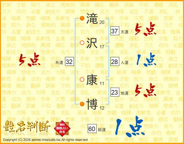 滝(20画)沢(17画) 康(11画)博(12画)