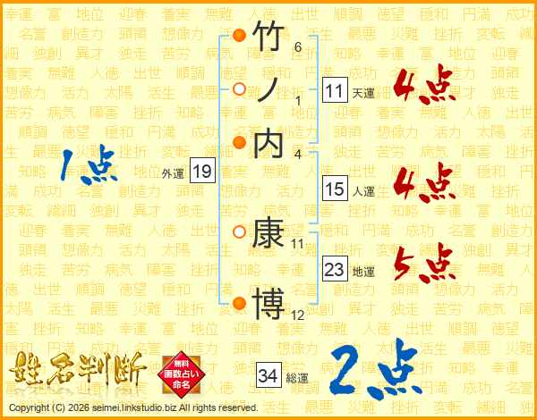 竹(6画)ノ(1画)内(4画) 康(11画)博(12画)