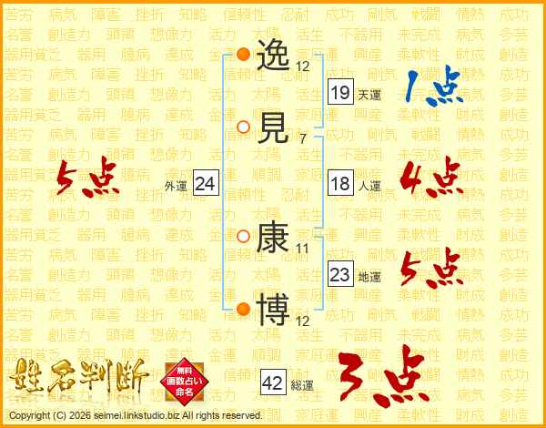 逸(12画)見(7画) 康(11画)博(12画)