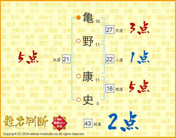 亀(16画)野(11画) 康(11画)史(5画)