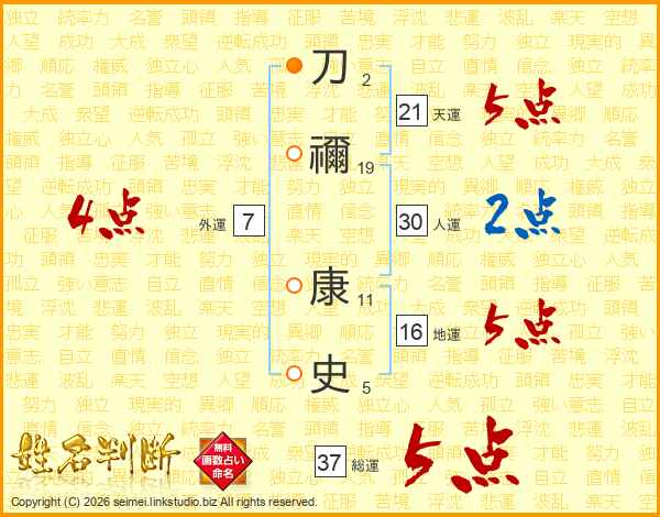 刀禰康史さんの総運は37画の5点!