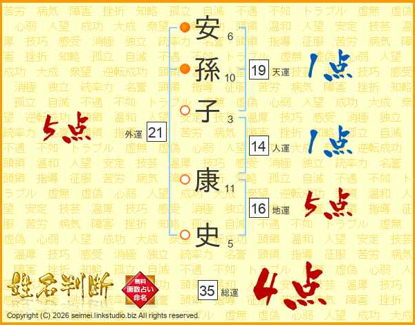 安(6画)孫(10画)子(3画) 康(11画)史(5画)