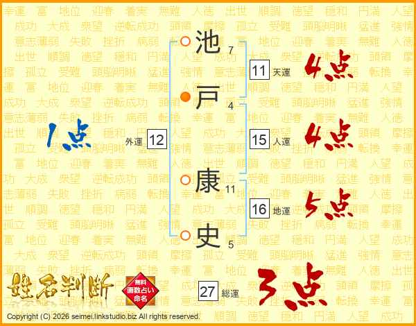 あなたの人生を表す1番重要な運勢です。生涯を通じて影響する総合運となり、主に50歳以降の晩年期に影響を及ぼします。苗字と名前の合計画数。
