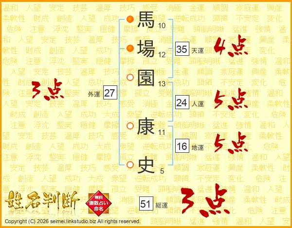 馬(10画)場(12画)園(13画) 康(11画)史(5画)