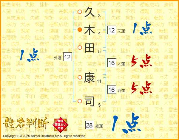 久(3画)木(4画)田(5画) 康(11画)司(5画)