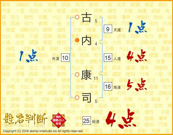 古(5画)内(4画) 康(11画)司(5画)