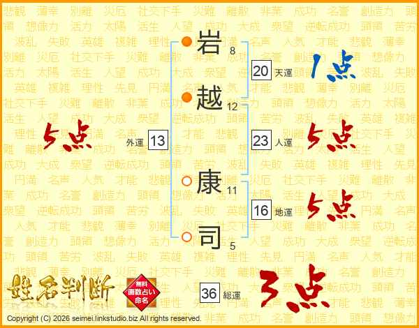 岩(8画)越(12画) 康(11画)司(5画)