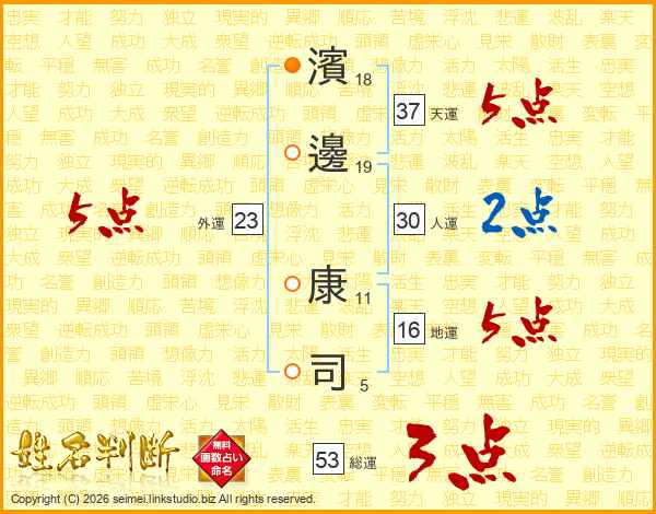 家系が持つ宿命的な運勢を表します。祖先から受け継いだ苗字ですので自分の力が及びません。家柄を象徴します。苗字の合計画数。