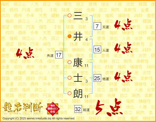 三(3画)井(4画) 康(11画)士(3画)朗(11画)