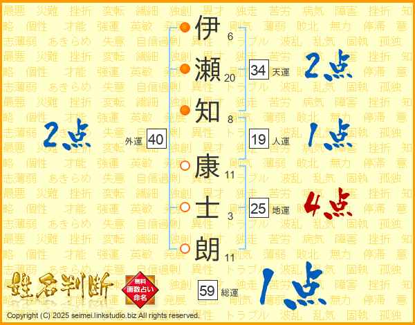 伊(6画)瀬(20画)知(8画) 康(11画)士(3画)朗(11画)