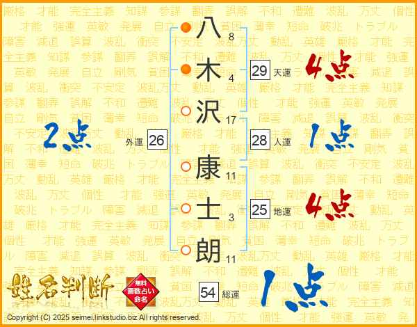 八(8画)木(4画)沢(17画) 康(11画)士(3画)朗(11画)