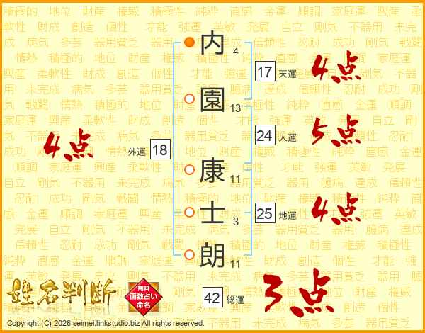 内(4画)園(13画) 康(11画)士(3画)朗(11画)