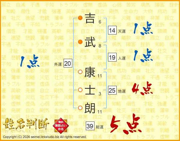 吉(6画)武(8画) 康(11画)士(3画)朗(11画)