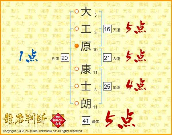 大(3画)工(3画)原(10画) 康(11画)士(3画)朗(11画)
