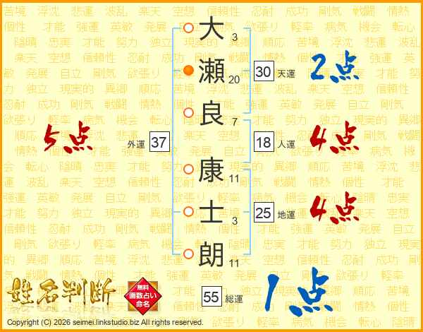 大(3画)瀬(20画)良(7画) 康(11画)士(3画)朗(11画)