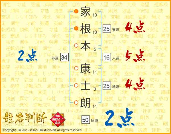 家(10画)根(10画)本(5画) 康(11画)士(3画)朗(11画)