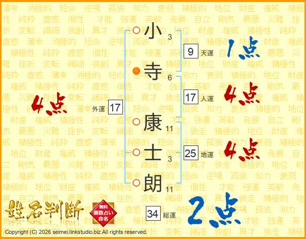 小(3画)寺(6画) 康(11画)士(3画)朗(11画)