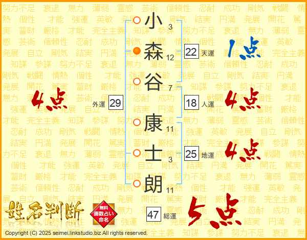 小(3画)森(12画)谷(7画) 康(11画)士(3画)朗(11画)