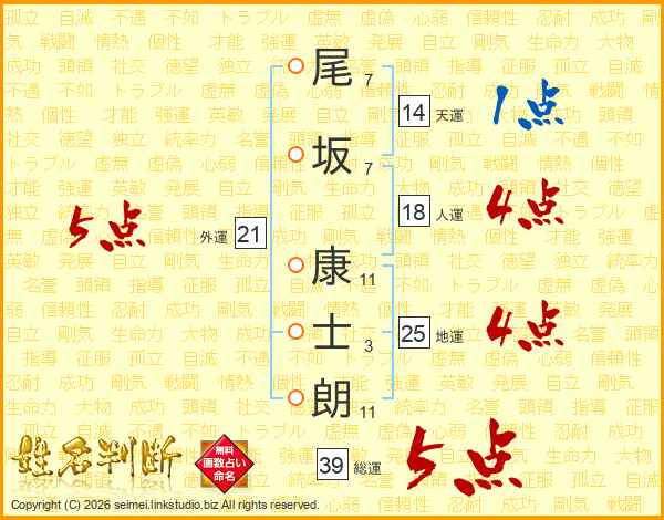 尾坂康士朗さんの総運は39画の5点!