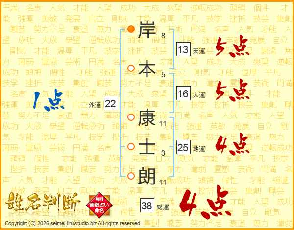 岸(8画)本(5画) 康(11画)士(3画)朗(11画)