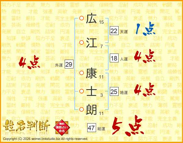 広(15画)江(7画) 康(11画)士(3画)朗(11画)