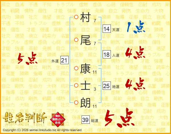 村尾康士朗さんの総運は39画の5点!