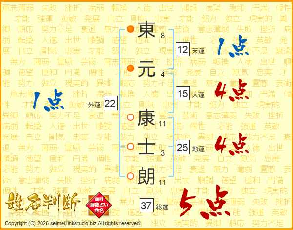 東(8画)元(4画) 康(11画)士(3画)朗(11画)