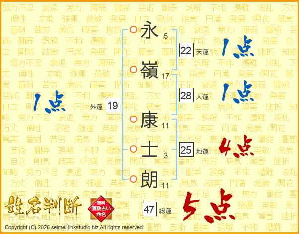 永(5画)嶺(17画) 康(11画)士(3画)朗(11画)