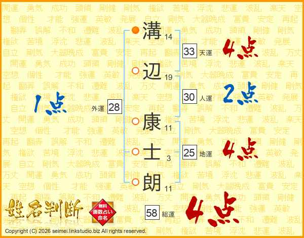 溝(14画)辺(19画) 康(11画)士(3画)朗(11画)