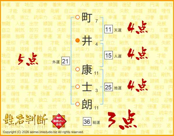 町(7画)井(4画) 康(11画)士(3画)朗(11画)