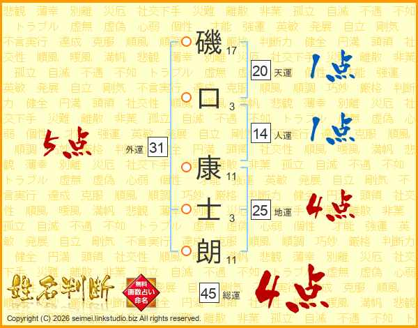 磯(17画)口(3画) 康(11画)士(3画)朗(11画)