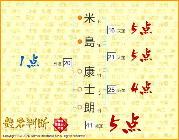 米(6画)島(10画) 康(11画)士(3画)朗(11画)