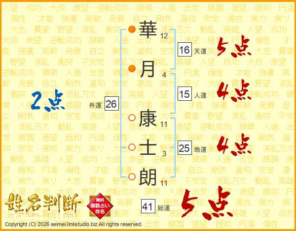 華(12画)月(4画) 康(11画)士(3画)朗(11画)