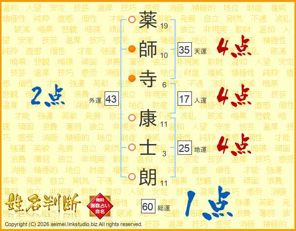 薬(19画)師(10画)寺(6画) 康(11画)士(3画)朗(11画)