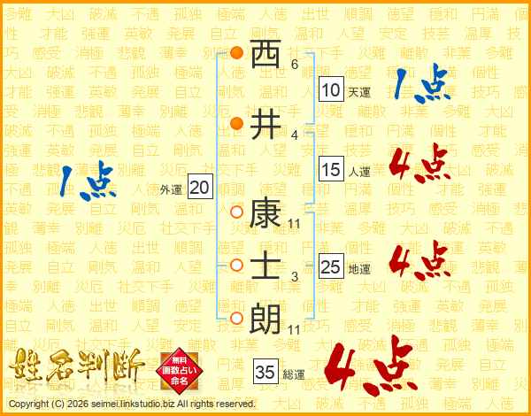 西(6画)井(4画) 康(11画)士(3画)朗(11画)