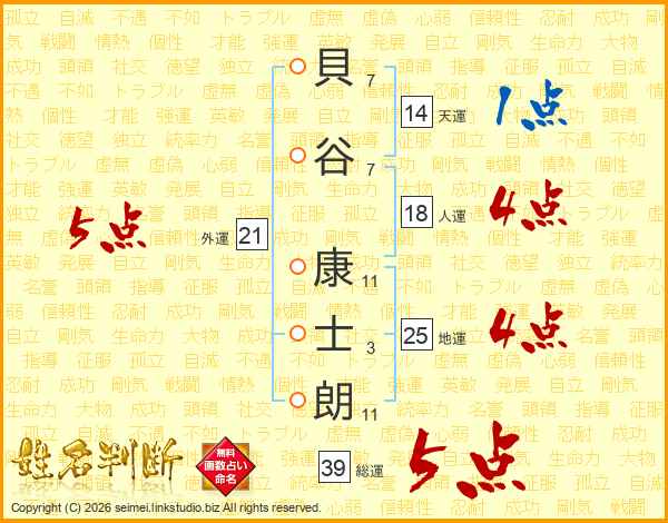 貝(7画)谷(7画) 康(11画)士(3画)朗(11画)