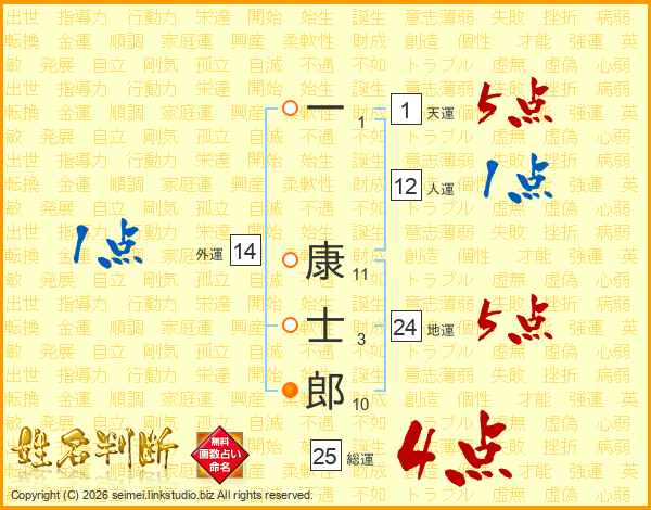 生活面を象徴する運勢です。外部から受ける影響力を表し、結婚運、家庭運や職場、環境への順応性を表します。総運から人運を引いた画数。姓や名が1文字の場合を除く。