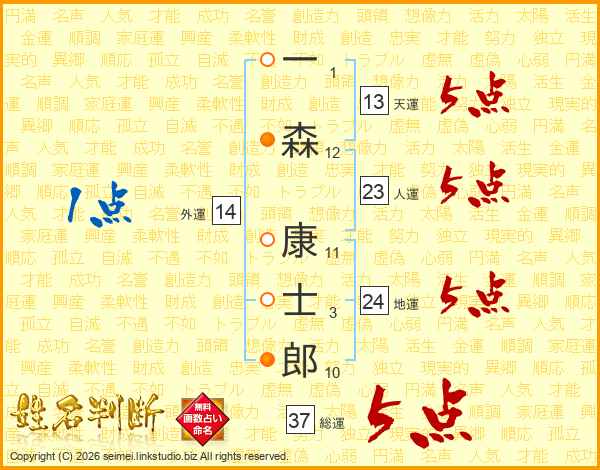 一(1画)森(12画) 康(11画)士(3画)郎(10画)