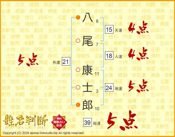 八(8画)尾(7画) 康(11画)士(3画)郎(10画)