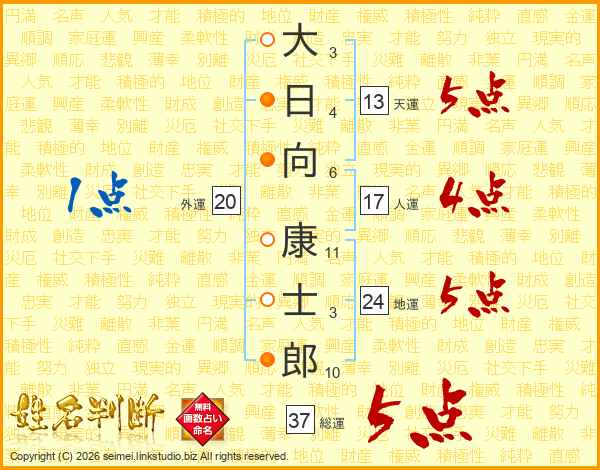 大(3画)日(4画)向(6画) 康(11画)士(3画)郎(10画)