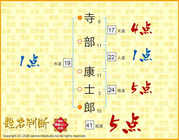 寺(6画)部(11画) 康(11画)士(3画)郎(10画)