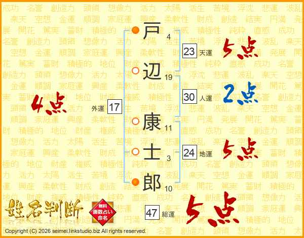 戸(4画)辺(19画) 康(11画)士(3画)郎(10画)